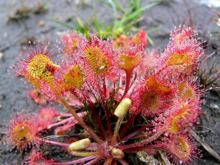 De zonnedauw bloeit van juni tot in augustus. En hij is te vinden in het Aekingerzand en bij de Ganzepoel, omdat hier vennetjes in de buurt zijn en het een voedingsstofarme grond is.